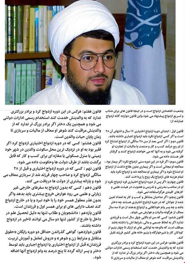 آنچه این روزها با عنوان «طرح ازدواج اجباری» مطرح می‌شود، هیچ جایگاهی در قانون ندارد و صرفاً یادداشتی قدیمی است که بار دیگر بازنشر شده است. ازدواج در ایران از منظر حقوقی و شرعی یک انتخاب شخصی است و هیچ فردی نمی‌تواند به اجبار به عقد دیگری درآید. بنابراین به جای توجه به شایعات، بهتر است تمرکز بر سیاست‌های واقعی برای رفع موانع ازدواج جوانان مانند اشتغال، مسکن و حمایت‌های اجتماعی باشد.